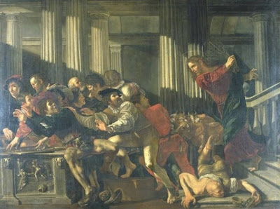 El Lunes Santo. Luego de haber pasado la noche en Betania, Jesús vuelve a la cercana Jerusalem y se dirige al templo, pero lo encuentra convertido en un mercado, lleno de comerciantes dispuestos a hacer negocios entre ellos. Viendo el fatídico espectáculo que tenía frente, Jesús se enfrenta a los vendedores y los echa del lugar, argumentando que era un lugar sagrado al que había que respetar; un lugar donde se iba a rendir culto.